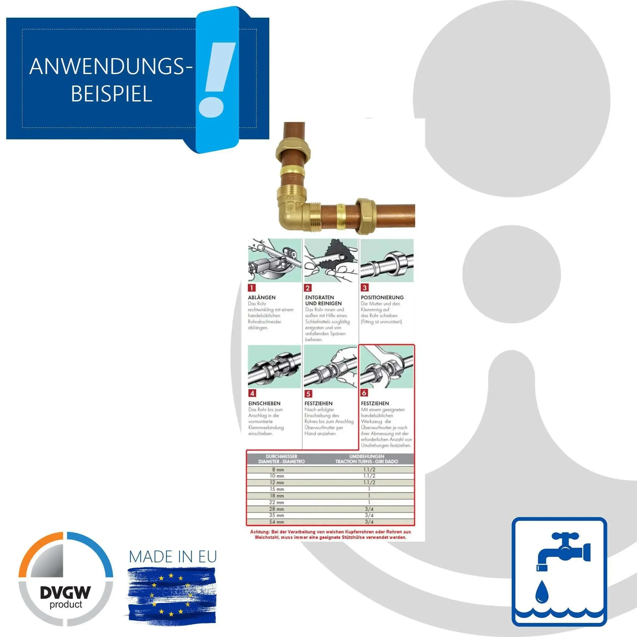 | Rohrtypen | Kupferrohr (DIN EN 1057), Präzisionsstahlrohr (DIN EN 10305-1) |